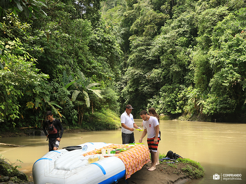 Quando o percurso no rio já estava mais ameno e se aproximando do fim, fizemos a parada para almoçar com direito a um pequeno mergulho no rio. Então, com tudo preparado na hora, eles nos serviram frutas picadas, bebidas, guacamole, chips, tortilhas e molhos. Tudo muito bem feito, fresquinho e delicioso!